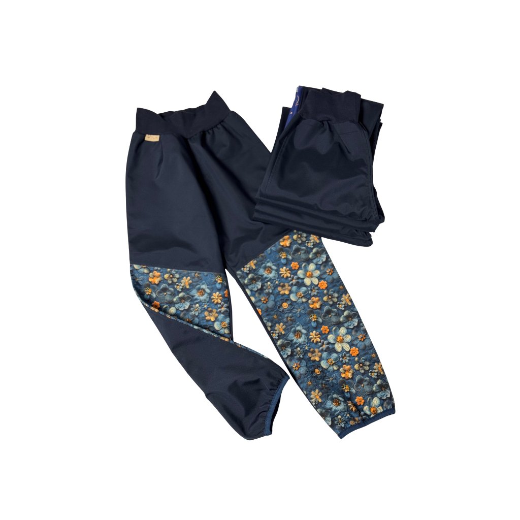 Letní softshellové kalhoty - tmavě modré s kytičkami